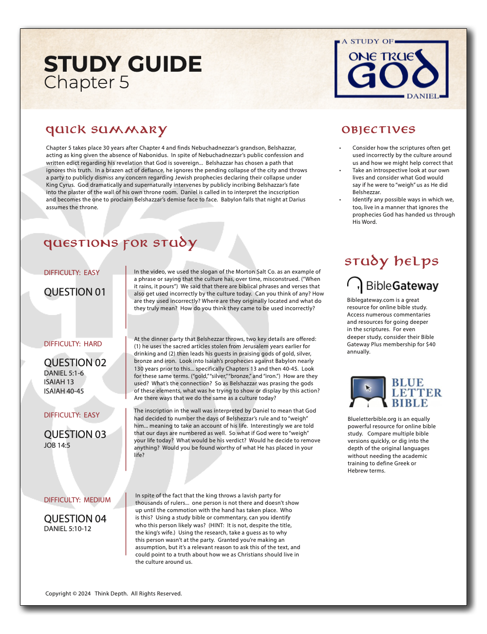 Think Depth exists to help foster biblical competency in the life of the Christ-follower. To that end, we see our videos as only part of that solution. We also provide guides for further exploration of the scriptures.